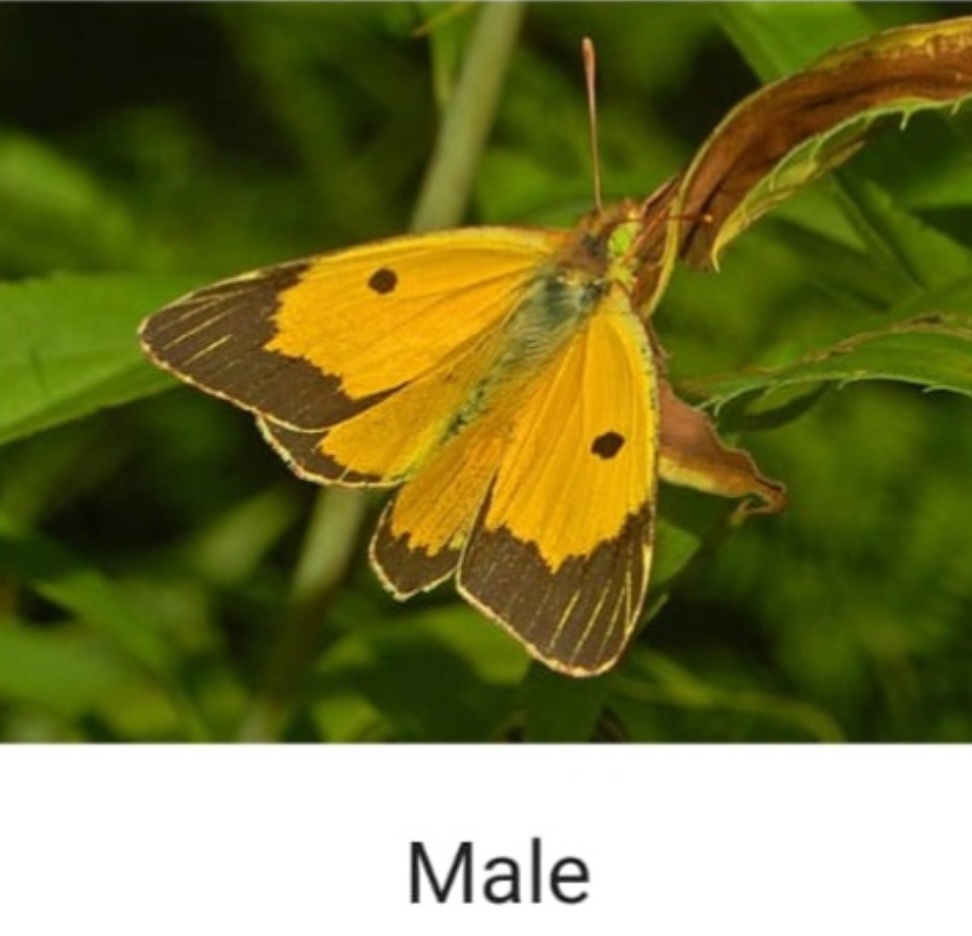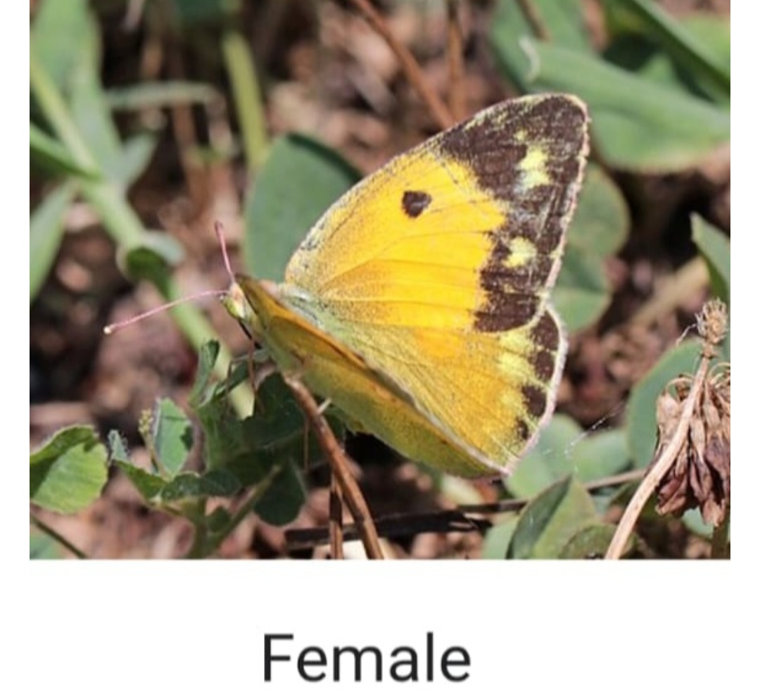 In flight, Colias croceus is easily identifiable by the intense yellow colouring, much brighter than that of the lemon-yellow male common brimstone which also lacks black markings. Like all Colias species they never open their wings at rest.