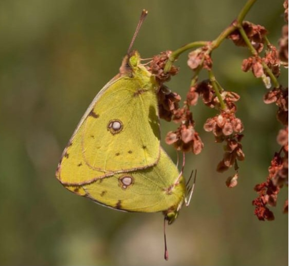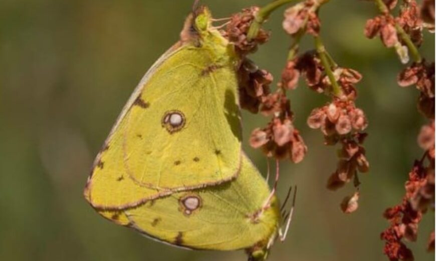 The species can live in any open area in the countryside, including downland, coastal cliffs and fields containing the caterpillar’s host plants, at an elevation up to 1,600 metres (5,200 ft) above sea level. Colias croceus has a wingspan of 46–54 millimetres (1.8–2.1 in), with the upperside of its wing being golden to orange yellow with a broad black margin on all four wings and a black spot near the centre forewing. This mating pair was photographed in Pirin National Park, Bulgaria.