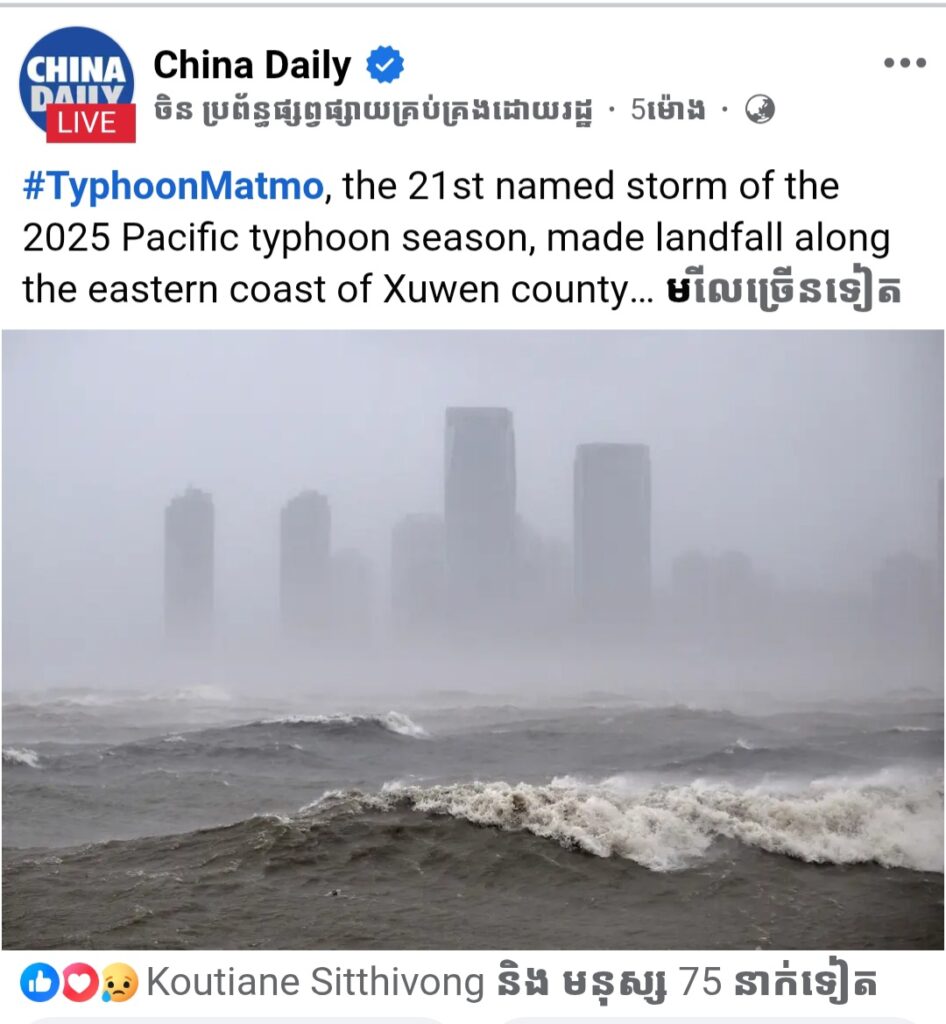 The typhoon is moving west-northwest and is expected to weaken after crossing into the Beibu Gulf later today. Heavy rain and storms are forecast. Matmo arrives during China’s National Day holiday travel rush, with an estimated 2.36 billion trips expected over the eight days.