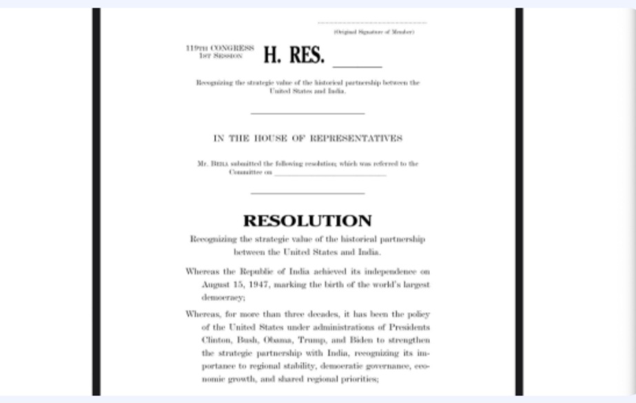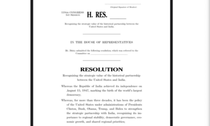The resolution highlights decades of deepening cooperation between two of the world’s largest democracies across critical sectors, including defence, technology, trade, counter-terrorism, and education.