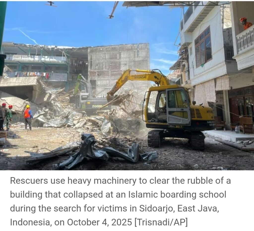 Hundreds of students, most of them teenage boys, were inside the Al-Khoziny Islamic Boarding School in the town of Sidoarjo when it collapsed on Monday, initially killing at least five students and injuring about 100.