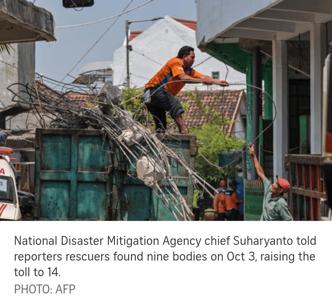 National Disaster Mitigation Agency (BNPB) chief Suharyanto told reporters rescuers found nine bodies on Friday, raising the toll to 14.