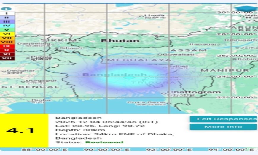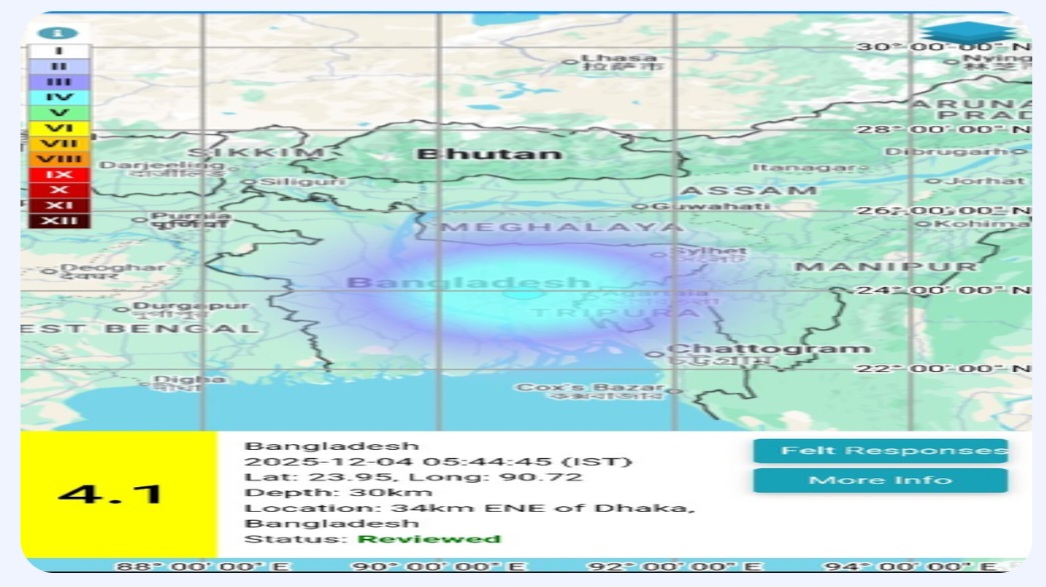 According to India’s National Centre for Seismology, the quake measured 4.1 on the Richter scale, with its epicentre located in Narsingdi near Dhaka.