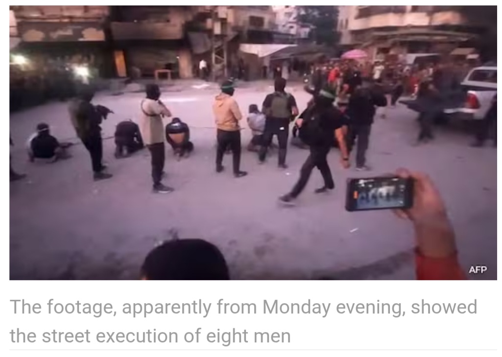 In the graphic video, eight badly beaten men can be seen blindfolded and kneeling in the street before each is shot dead by gunmen wearing the green headbands associated with Hamas.