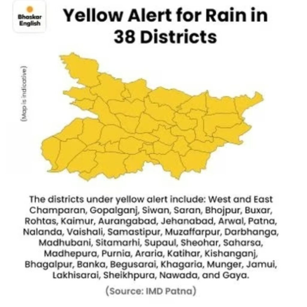 The monsoon has reactivated over Bihar, prompting the Indian Meteorological Department (IMD) to issue a yellow alert for 38 districts across the state on Friday. Authorities have warned of continuing rainfall over the next few days, with the possibility of heavy showers and lightning in several areas.