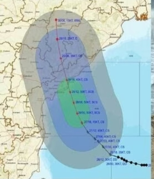 According to IMD, the cyclonic storm will make landfall about 200 km from Odisha’s Malkangiri, near Andhra Pradesh’s Kakinada, between Machilipatnam and Kalingapatnam on the evening or night of 28 October.