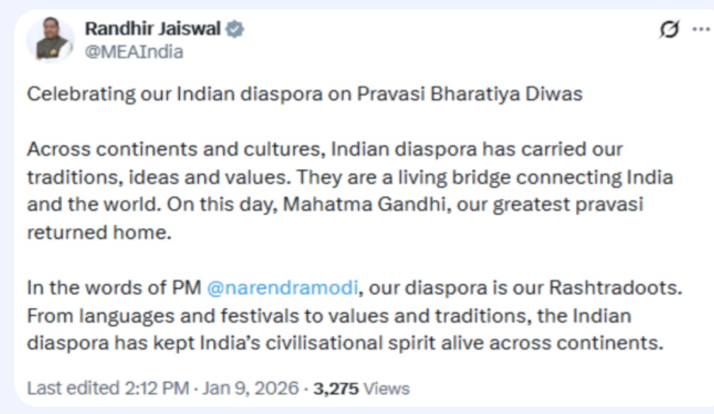 In a social media post, the External Affairs Ministry said the Indian diaspora has carried the country’s traditions, ideas and values across continents and cultures.