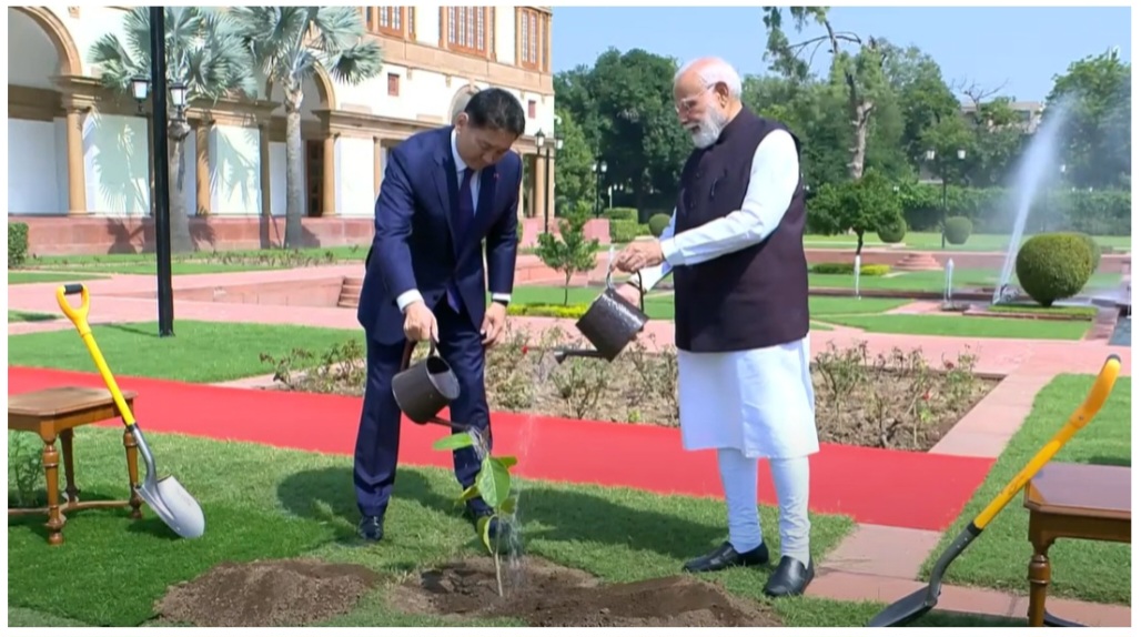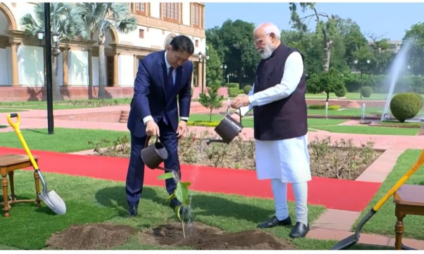 Prime Minister Narendra Modi met Mongolian President Khurelsukh Ukhnaa at Hyderabad House in New Delhi on Tuesday. The two leaders greeted each other and planted a sapling before proceeding to hold talks.