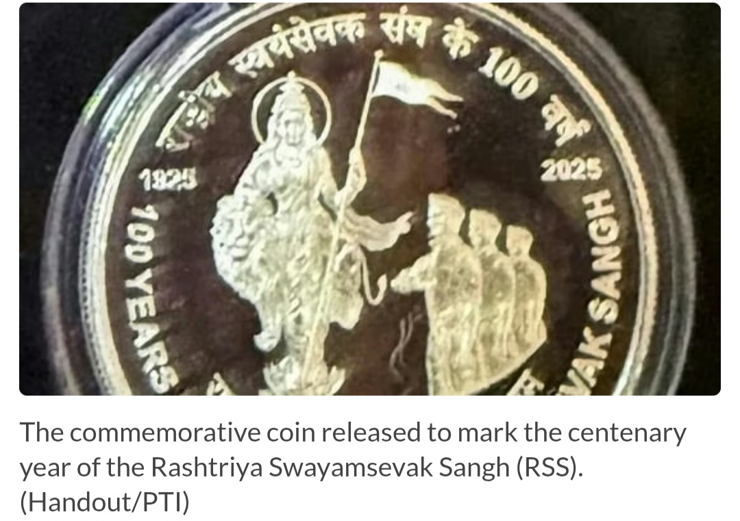 The ₹100 coin, released by the PM at Delhi’s Ambedkar International Centre, features the national emblem on one side and an image of ‘Bharat Mata’ in ‘Varad Mudra’ (hand position representing giving or granting blessings), with a lion, being saluted by swayamsevaks, on the other.