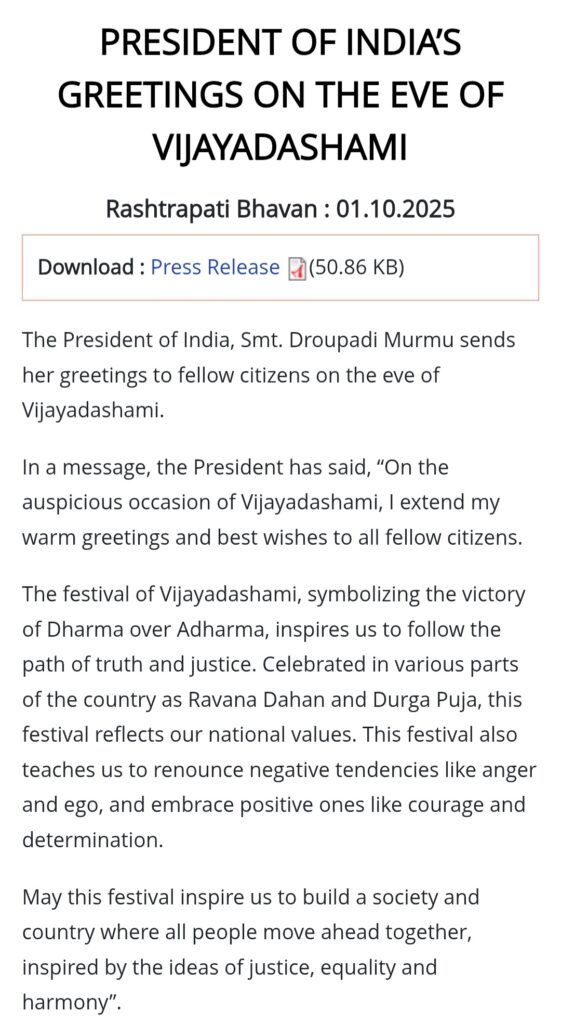 President Droupadi Murmu has greeted the nation on the occasion of Vijayadashami. In a message, the President said that the festival symbolises the victory of Dharma over Adharma and inspires people to follow the path of truth and justice. She highlighted that the festival, celebrated in various parts of the country as Ravana Dahan and Durga Puja, reflects national values.