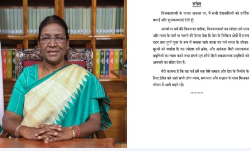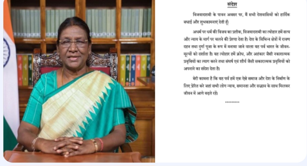 President Droupadi Murmu has greeted the nation on the occasion of Vijayadashami. In a message, the President said that the festival symbolises the victory of Dharma over Adharma and inspires people to follow the path of truth and justice. She highlighted that the festival, celebrated in various parts of the country as Ravana Dahan and Durga Puja, reflects national values.