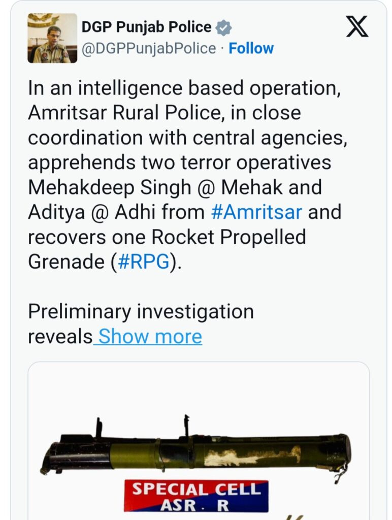 In a major intelligence-led operation, the Amritsar Rural Police, working closely with central agencies, arrested two terror operatives and recovered a rocket-propelled grenade (RPG) intended for a targeted terror attack in Punjab.