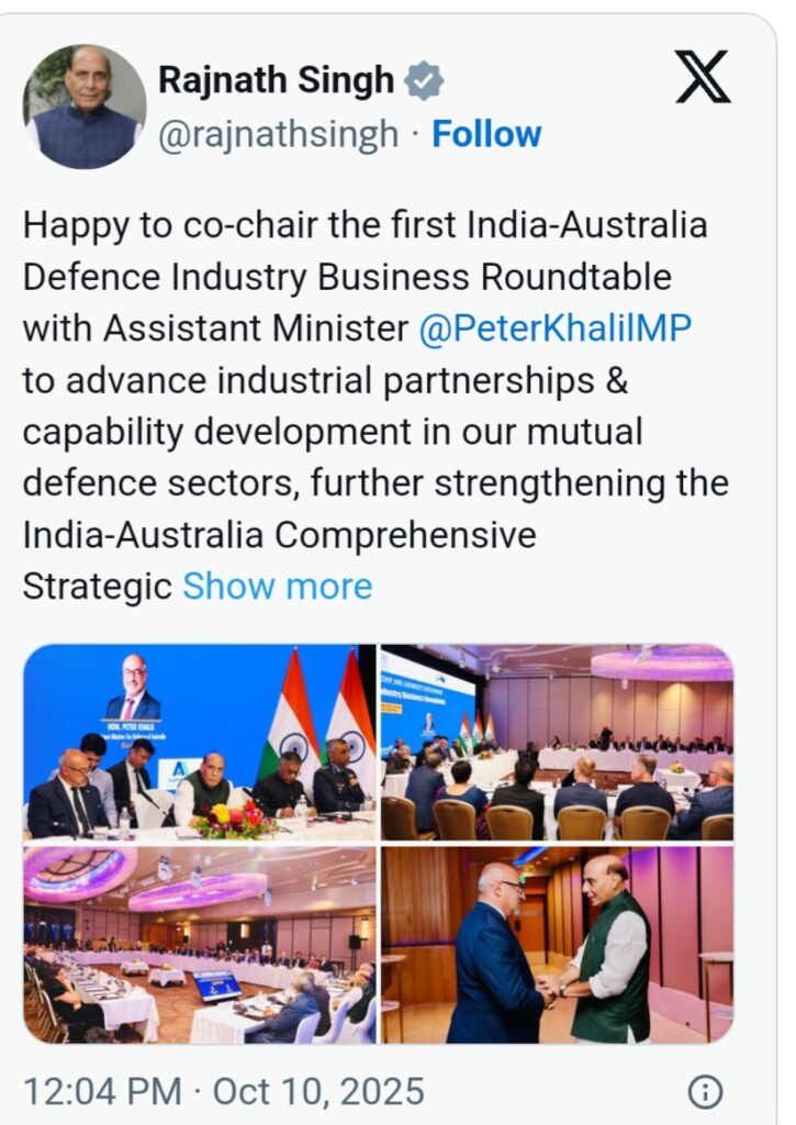 Later in the day, Singh and Khalil co-chaired the inaugural India–Australia Defence Industry Business Roundtable, aimed at advancing industrial partnerships and capability development between the two nations.