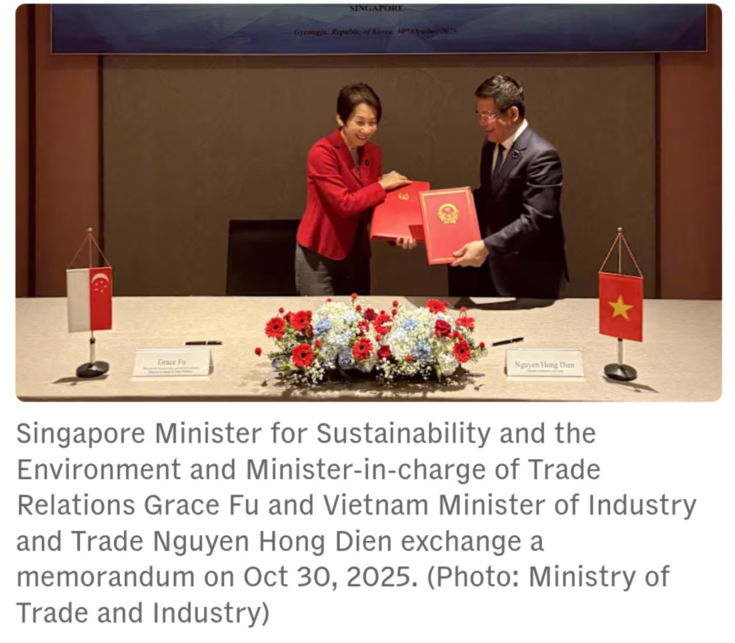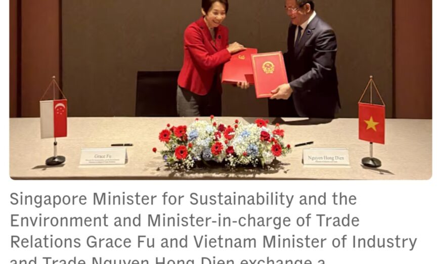 The agreement was signed by Minister for Sustainability and the Environment and Minister-in-charge of Trade Relations, Ms Grace Fu, and Vietnam’s Minister of Industry and Trade Nguyen Hong Dien.