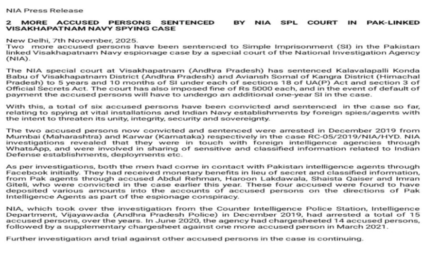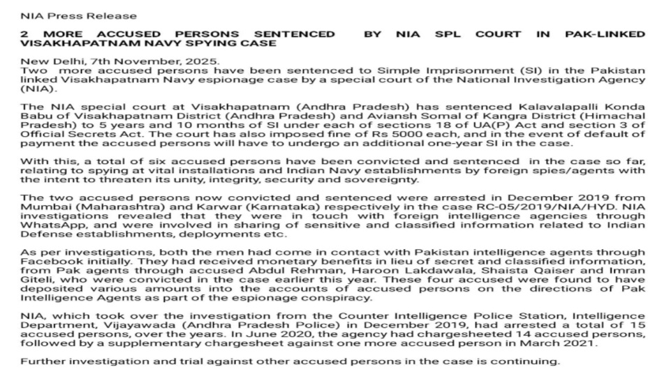 A special court of the National Investigation Agency (NIA has sentenced two more accused to imprisonment in the Pakistan-linked Visakhapatnam Navy espionage case.