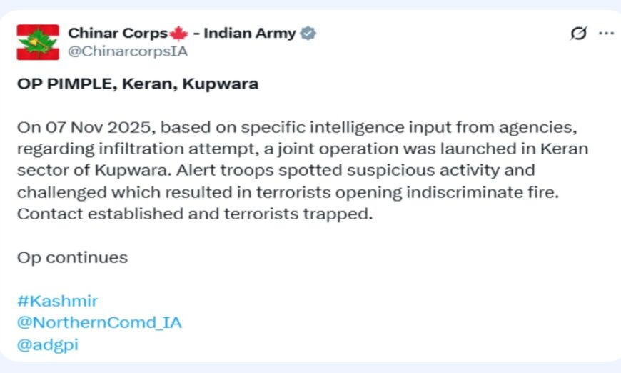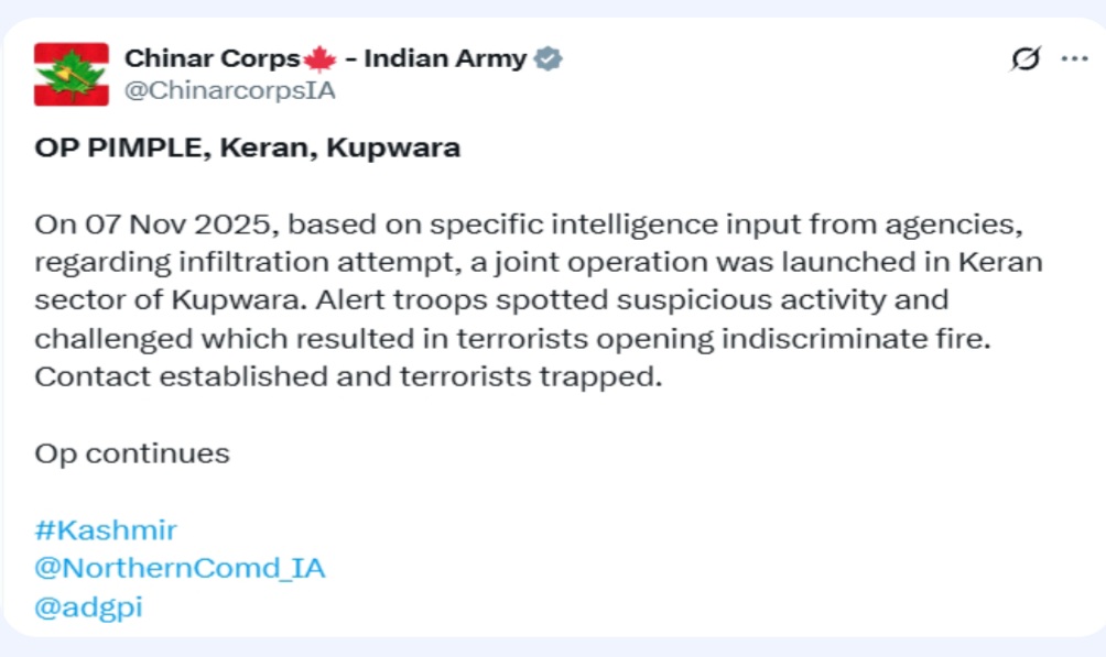 “Based on specific intelligence input from agencies regarding an infiltration attempt, a joint operation was launched in the Keran sector of Kupwara,” the Army’s Srinagar-based Chinar Corps posted on X.
