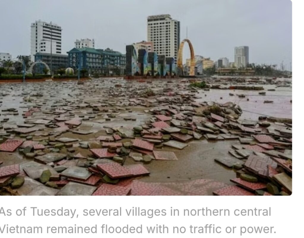 As of Tuesday, several villages in northern central Vietnam remained flooded with no traffic or power, state media reported.