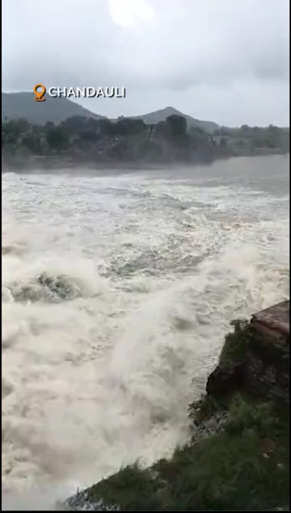 In Chandauli’s Chakia tehsil, water from Latif Shah dam began overflowing. The irrigation department reported 11,600 cusec of water released. Residents near the dam have been advised to remain alert.