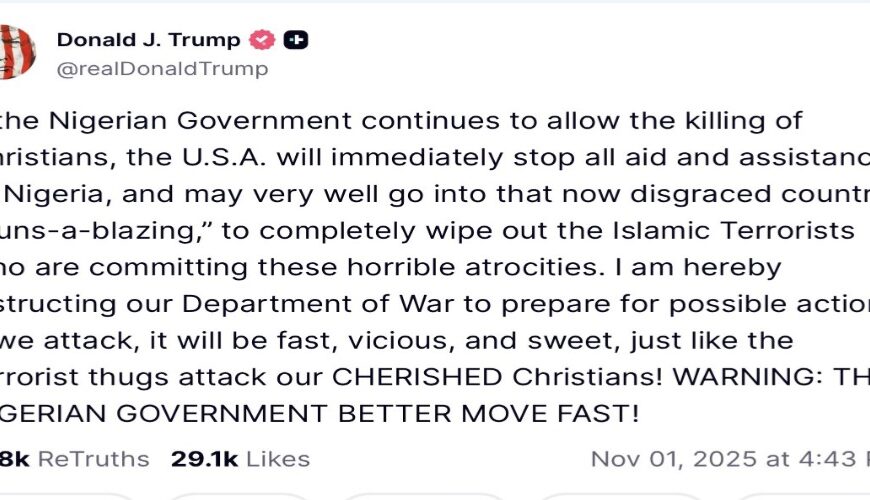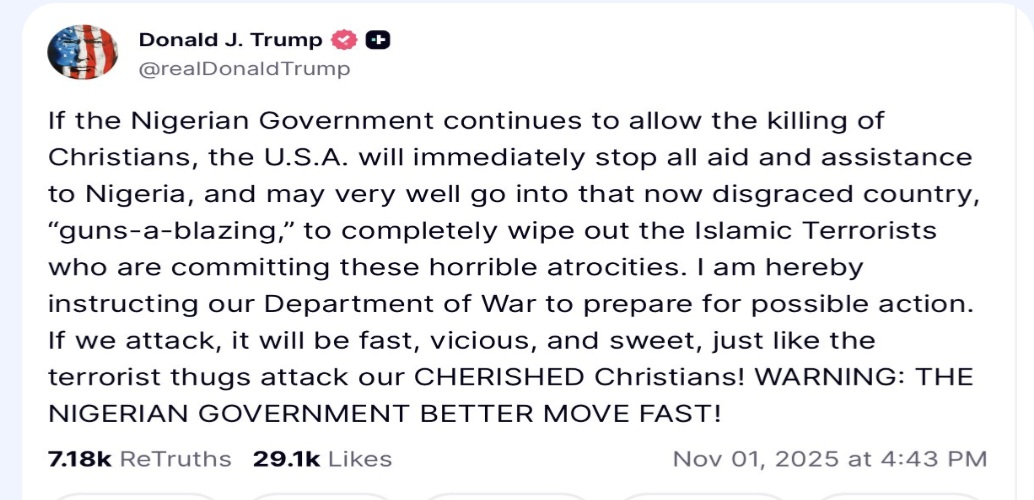 In a social media post, Trump said the United States would immediately stop all aid and assistance to Nigeria if the country fails to act against the killings of Christians.