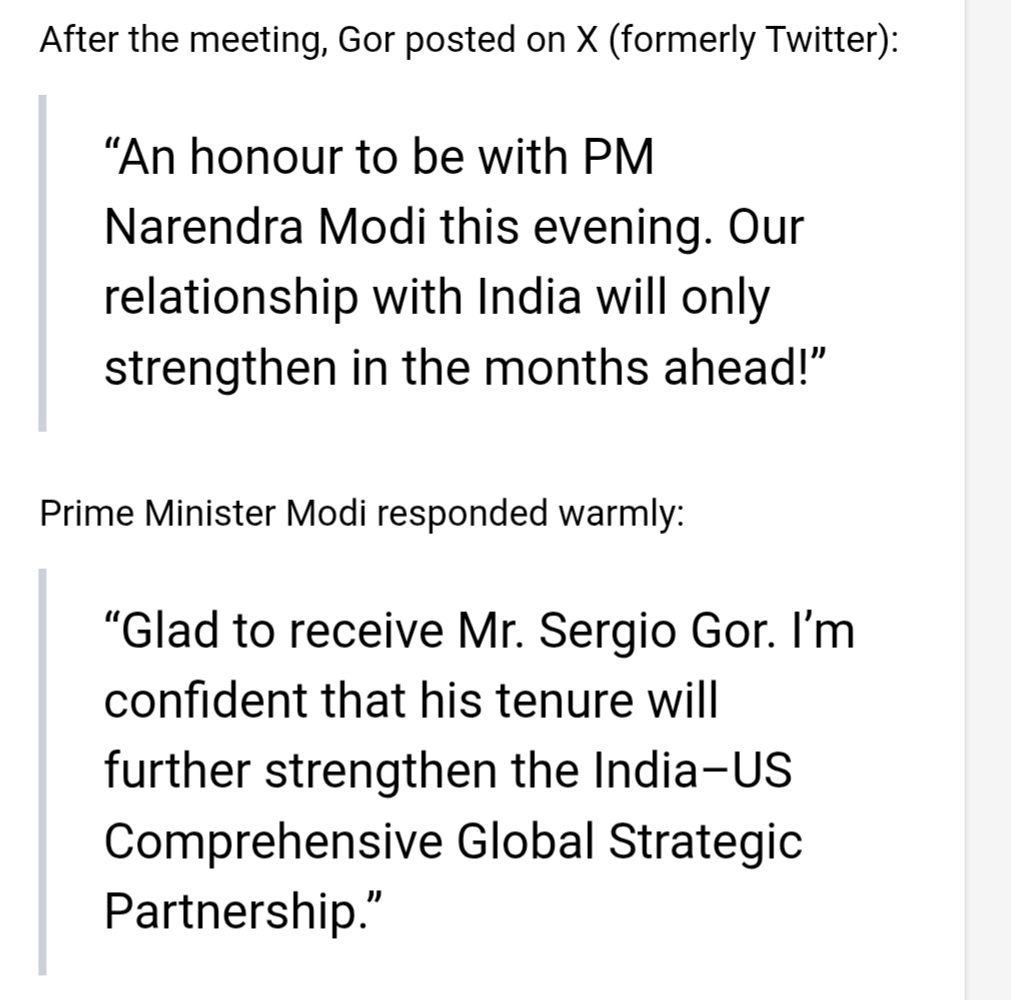 Soon after his Senate confirmation, Gor made a four-day visit to India, where he met Prime Minister Narendra Modi and other senior officials.