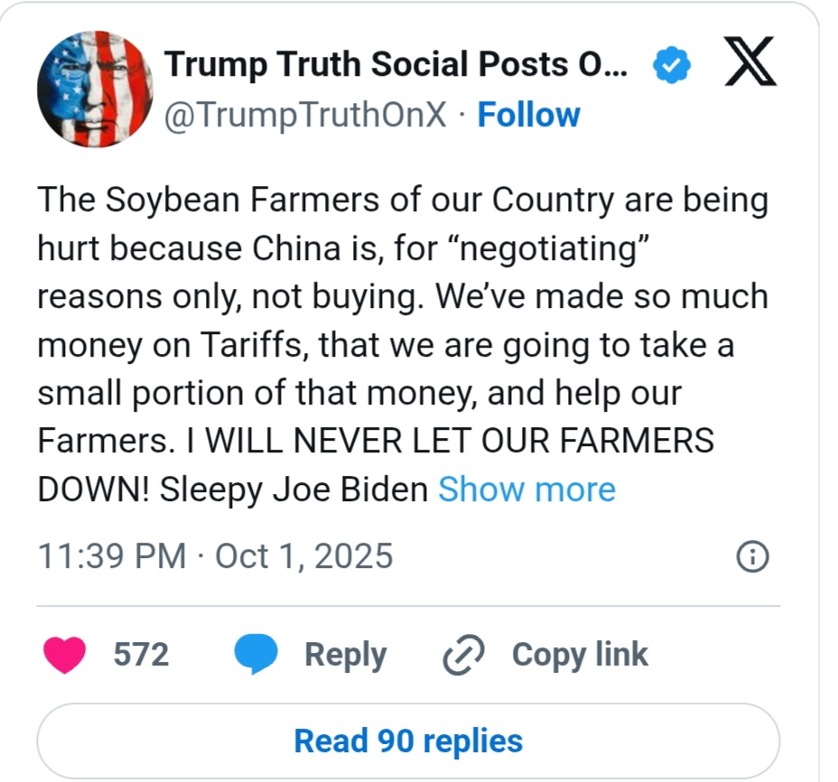 “The Soybean Farmers of our Country are being hurt because China is, for ‘negotiating’ reasons only, not buying,” Trump wrote on his Truth Social platform.