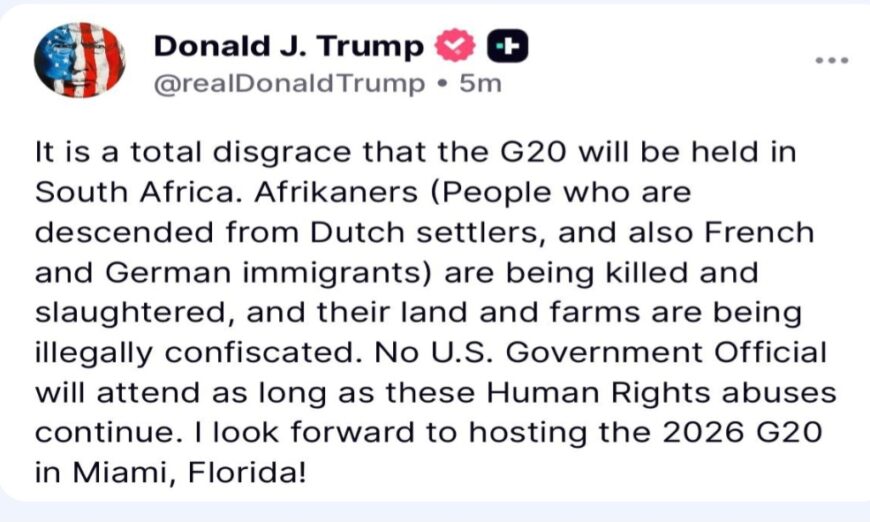 US President Donald Trump has announced that no American officials will attend this year’s G20 Summit in South Africa, citing allegations of mistreatment toward the country’s minority white farmers.
