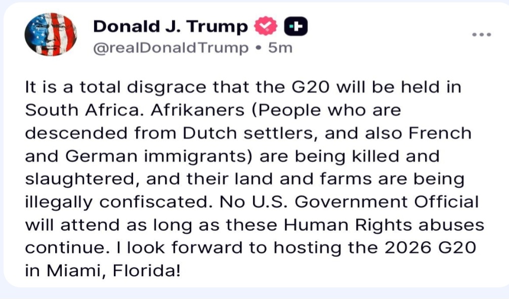 President Trump accused the South African government of permitting violence, killings, and illegal land seizures against Afrikaners. He added that he looks forward to hosting the 2026 G20 summit in Miami instead.