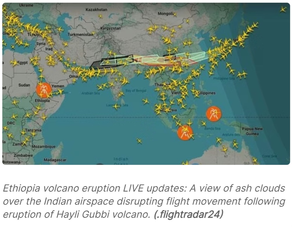 Multiple Indian carriers have suspended or diverted multiple flights to West Asia after volcanic ash from Ethiopia’s Hayli Gubbi volcano drifted across the Arabian Peninsula, creating unsafe conditions for aviation.